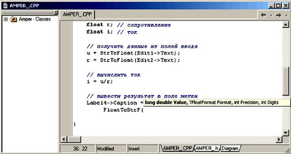 Вычисленная величина силы тока выводится в поле Label4 путем присваивания значения свойству Caption. Для преобразования числа в строку символов (свойство Caption - строкового типа) используется функция FloatToStrF.