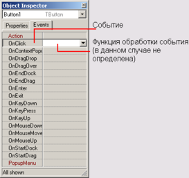 Чтобы приступить к созданию функции обработки события, сначала надо выбрать компонент, для которого создается функция обработки события. Выбрать компонент можно в окне Object Inspector или щелчком на изображении компонента в форме. После этого в окне Object Inspector нужно выбрать вкладку Events (События).
