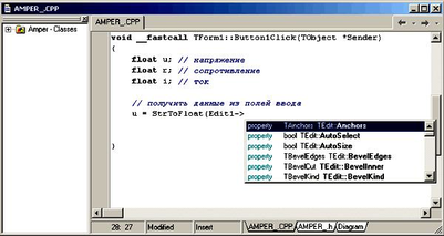 Следует обратить внимание, что если список свойств и методов не появляется, то это значит, что в программе обнаружена ошибка (C++ Builder контролирует правильность набираемого программистом текста в "фоновом" режиме). Например, если в окне редактора кода набрать if Edit1->, то список свойств и методов объекта Edit1 не появится, т. к. инструкция if в данном случае записана с ошибкой (не поставлена открывающая скобка после if). C++ Builder информирует программиста об обнаруженной ошибке сообщением Unable to invoke Code Completion due to errors in source code, которое появляется в нижней части окна редактора кода.