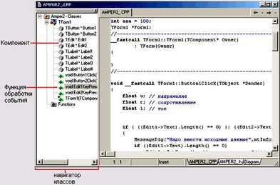 C++ Builder присваивает функции обработки события имя, которое состоит из двух частей. Первая часть имени идентифицирует форму, содержащую объект (компонент), для которого создана процедура обработки события. Вторая часть имени идентифицирует сам объект и событие. В нашем примере имя формы — Form1, имя командной кнопки — Button1, а имя события — Click.
