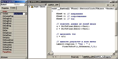 Вид созданной формы подсказывает, как работает приложение. Очевидно, что пользователь должен ввести в поля редактирования исходные данные и щелкнуть мышью на кнопке Вычислить. Щелчок на изображении командной кнопки — это пример того, что в Windows называется событием. Событие (Event) — это то, что происходит во время работы программы. В C++ Builder каждому событию присвоено имя. Например, щелчок кнопкой мыши — это событие Onclick, двойной щелчок мышью — событие OnDb1Click.