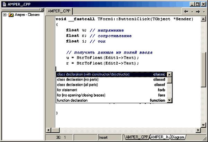 Редактор кода предоставляет программисту большой набор шаблонов: объявления классов, функций, инструкций выбора (if, switch), циклов (for, while). Для некоторых инструкций, например для if и while, есть несколько вариантов шаблонов.