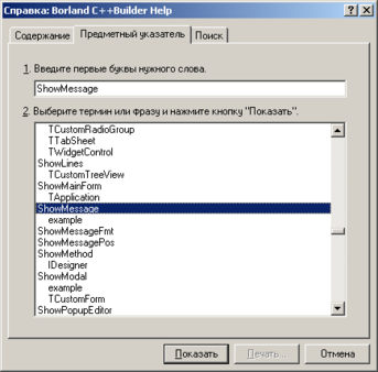 Справочную информацию можно получить также, выбрав из меню Help команду C++ Builder Help. В этом случае на экране появится стандартное окно справочной системы. В этом окне на вкладке Предметный указатель нужно ввести ключевое слово, определяющее тему, по которой нужна справка. В качестве ключевого слова можно ввести, например, первые несколько букв имени функции, свойства или метода (рис. 28).