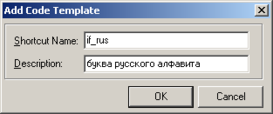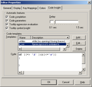 Программист может создать свой собственный шаблон кода и использовать его точно так же, как и стандартный. Для того чтобы создать шаблон кода, нужно в меню Tools выбрать команду Editor Options и в окне Code Insight щелкнуть на кнопке Add. В появившемся окне Add Code Template (рис. 2.25) надо задать имя шаблона (Shortcut Name) и его краткое описание (Description). Затем, после щелчка на кнопке ОК, в поле Code надо ввести шаблон (рис. 30).