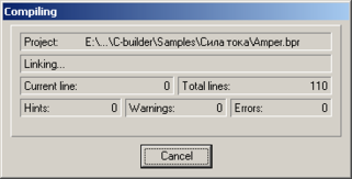 Процесс преобразования исходной программы в выполняемую состоит из двух этапов: непосредственно компиляции и компоновки. На этапе компиляции выполняется перевод исходной программы в некоторое внутреннее представление. На этапе компоновки выполняется сборка (построение) программы. После ввода текста функции обработки события и сохранения проекта можно, выбрав в меню Project команду Compile, выполнить компиляцию. Процесс и результат компиляции отражается в диалоговом окне Compiling (рис. 35). Если в программе нет синтаксических ошибок, то окно будет содержать сообщение: Done: Compile Unit, в противном случае будет выведено сообщение Done: There are errors.