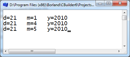cout<<"\nd=" <<d << " m=" <<m << " y="<<y;