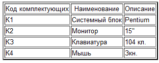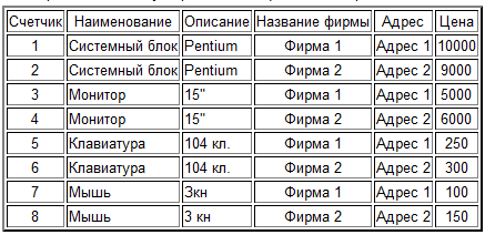 Поясним это на примере. Пусть табличная база данных "Комплектующие компьютера и поставщики" содержит информацию о различных комплектующих и имеет поля: "Счетчик", "Наименование", "Описание", "Название фирмы", "Адрес", "Цена" (в рублях) - табл. 1.