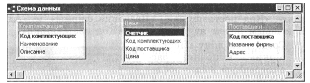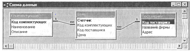 Таблицы "Комплектующие" и "Поставщики" должны быть связаны отношением "один-ко-многим" с таблицей "Цена". Таблица "Цена" содержит однотипные с полями первых двух таблиц поля "Код комплектующих" и "Код поставщика", являющиеся внешними ключами исходных таблиц.