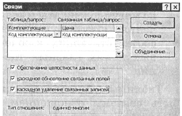 Две таблицы, находящиеся в отношении "многие-ко-многим", могут быть связаны только с помощью третьей (связующей) таблицы. Таблицы "Комплектующие" и "Поставщики" можно связать в отношении "многие-ко-многим" путем создания двух связей "один-ко-многим" по отношению к таблице "Цена".