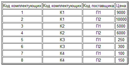 Естественно разделить исходную таблицу на две: "Комплектующие" (табл. 2) и "Поставщики" (табл. 3).