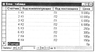 6. С помощью аналогичных действий создать таблицу "Цена" и ввести данные. В полях внешних ключей не могут содержаться значения, отсутствующие в соответствующих ключевых полях главных таблиц.