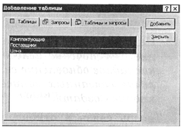 7. Ввести команду [Сервис-Схема данных]. Появится диалоговая панель Добавление таблицы. Выделить в этом окне нужные таблицы и щелкнуть по кнопке Добавить.