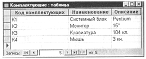 4. Для ввода данных в таблицу щелкнуть на значке Комплектующие. Ввести данные в таблицу.