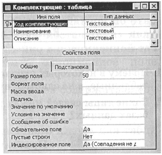 3. В окне Комплектующие: таблица ввести имена полей, тип данных и параметры полей.