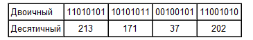 Для удобства восприятия двоичный 32-битовый Интернет-адрес можно разбить на четыре части по 8 битов и каждую часть представить в десятичной форме. Десятичный Интернет-адрес состоит из четырех чисел в диапазоне от 0 до 255, разделенных точками (например, 213.171.37.202) (табл.1).