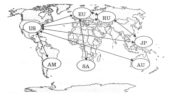 Надежность функционирования глобальной сети обеспечивает большое количество каналов передачи информации с высокой пропускной способностью между локальными, региональными и корпоративными сетями. Например, российская региональная компьютерная сеть Рунет (RU) соединяется многочисленными каналами передачи информации с северо-американской (US), европейской (EU) и японской (JP) региональными сетями (рис. 5).