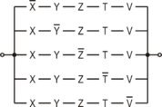 Задача: ток должен протекать, когда замкнуты любые 4 переключателя x, y, z, t, v.