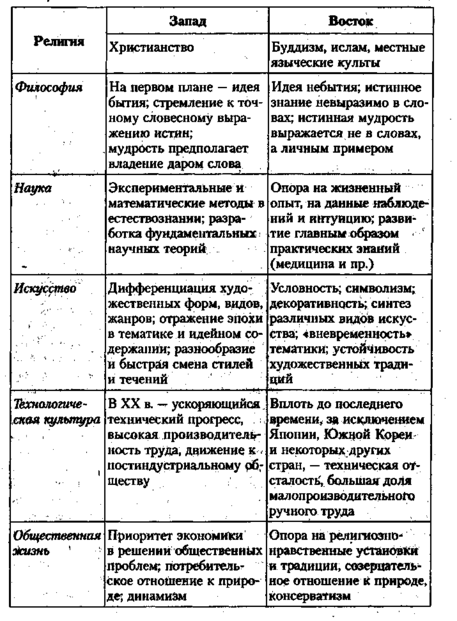 Отмечаемые многими исследователями культурные различия между Западом и Востоком представлены в таблице.