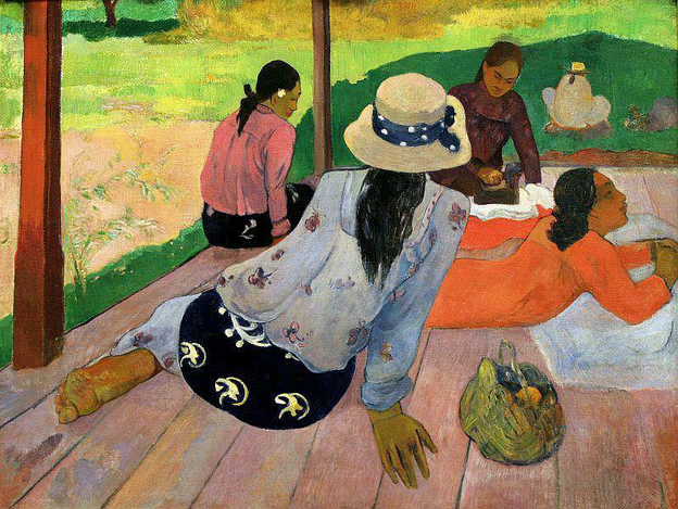 Картина «Сиеста» не является исключением. На ней изображен ничем не примечательный кусок веранды, на котором отдыхают четыре девушки. Они одеты в колониальные платья, однако их экзотичная внешность и непринужденные, почти первобытные позы выдают истинную сущность природы и быта острова Таити, почти не тронутого европейской культурой. Привычный для местных жителей уклад жизни – размеренный и бесхитростный, они живут в полной гармонии с окружающей флорой и фауной и являются их неотъемлемой частью. Секрет этой вездесущей гармонии не ясен цивилизованному европейцу, отчего он проникается уважением к таитянам как к носителям многовековой тайны.