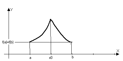 Пусть функция y=f(x) непрерывна на отрезке [a,b] и дифференцируема на (a,b). Кроме того на концах интервала она принемает равные значения f(a)=f(b), тогда с(a,b): f(c)=0