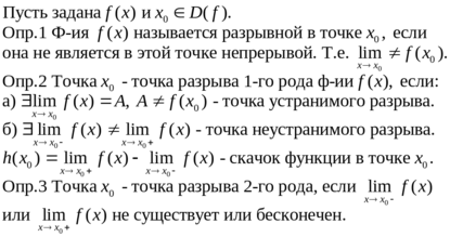 Определение: функция f(x) непрерывна, если: 1)она определена в х0 и некоторой ее окресности.2.Lim f(x)=f(x) при x->x0