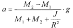 где Т1 и Т2 - силы натяжения нитей; а - линейное ускорение грузов; N - величина результирующего момента сил натяжения нитей. Момент силы Т2 направлен вдоль оси вращения за чертёж, а направление момента силы Т1 - прямо противоположно. Поэтому: