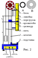 Определить длину участка движения грузов h с помощью линейки 3 по уровню кронштейна 4. Записать h, а также массу цилиндра и перегрузка типа А М1 в табл. 1.