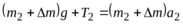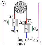 Рассмотрим систему, изображенную на рис. 1, состоящую из двух цилиндров массой m1, m2 и перегрузка m, добавленного к правому цилиндру. Предположим, что цилиндры связаны нерастяжимой нитью, перекинутой через невесомый блок, трение отсутствует. Запишем уравнение движения (второй закон Ньютона) для левого и правого грузов:
