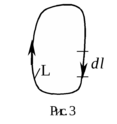 В этой формуле кружок на знаке интеграла показывает, что интегрирование производится по замкнутой траектории. Часто замкнутую траекторию L называют замкнутым контуром L (рис. 3). Обычно задаются направлением обхода контура L по ходу часовой стрелки. Направление элементарного вектора перемещения