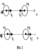 Ограничимся рассмотрением центрального удара двух шаров, при котором шары движутся вдоль прямой, проходящей через их центры. На рис. 1 изображены два возможных случая центрального удара.