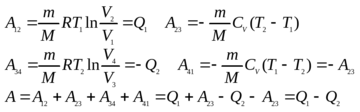 1-2 и 3-4 -изотермическое расширение и сжатие , 2-3 и 4-1 - адиабатическое расширение и сжатие.