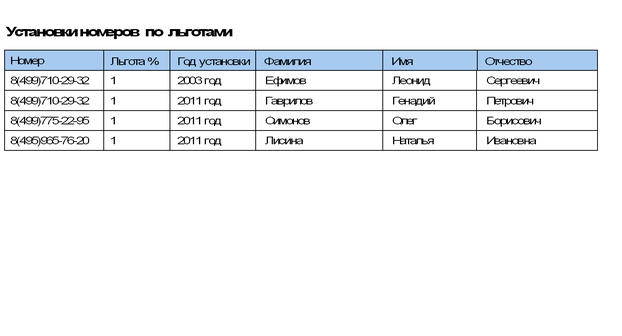 5) Используя приложение, созданное в практическом занятии № 2, спроектируйте и создайте запрос следующего вида: Создайте отчет, содержащий номера телефонов абонентов, у которых есть льготы, с указанием ФИО и адреса владельца, года установки. Отчет создайте на основе компоненты TQuery.