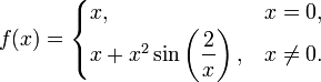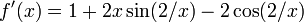 График производной функции f(x) = x + x2sin(2 / x) при приближении x к нулю справа.