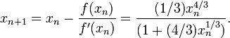 Скорость сходимости полученной последовательности составляет приблизительно 4/3. Это существенно меньше, нежели 2, необходимое для квадратичной сходимости, поэтому в данном случае можно говорить лишь о линейной сходимости, хотя функция всюду непрерывно дифференцируема, производная в корне не равна нулю, и
