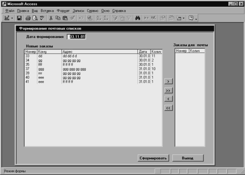 Разработать форму для перемещения произвольно выбранных пользователем записей из основной таблицы в архивную таблицу. Для произвольного выбора записей использовать список с множественным выбором. Пример формы, в которой используются два списка с множественным выбором строк, приведен на рис. 7. Кнопки между списками предназначены для перемещения выбранной информации из одного списка в другой. Кнопка Сформировать предназначена для выполнения операции формирования почтового списка из отобранных записей. Варианты основной таблицы приведены в табл. 1.