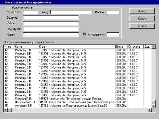Разработать форму для поиска группы записей по заданным критериям. Пример формы для поиска заказов приведен на рис. 5. Форма содержит поля для задания условий отбора записей, список, в котором отображаются записи, отвечающие условиям поиска, и командные кнопки. Кнопка Поиск выполняет поиск записей и вывод в список найденных записей. Кнопка Сброс сбрасывает текущие условия поиска, заполняя поля пустыми значениями, и выводит все записи. Варианты задания приведены в табл. 4.
