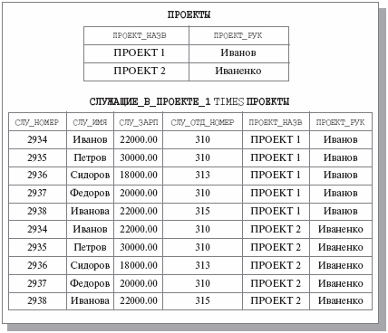 Для наглядности предположим, что в придачу к введенным ранее отношениям СЛУЖАЩИЕ_В_ПРОЕКТЕ_1 и СЛУЖАЩИЕ_В_ПРОЕКТЕ_2 в базе данных содержится еще и отношение ПРОЕКТЫ со схемой {ПРОЕКТ_НАЗВ, ПРОЕКТ_РУК} (имена доменов снова опущены) и телом, показанным на рис. На этом же рисунке показан результат операции СЛУЖАЩИЕ_В_ПРОЕКТЕ_1 TIMES ПРОЕКТЫ.