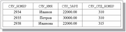 Результат выполнения операции СЛУЖАЩИЕ_В_ПРОЕКТЕ_1 WHERE (СЛУ_ЗАРП > 20000.00 AND (СЛУ_ОТД_НОМ = 310 OR СЛУ_ОТД_НОМ = 315)) (получить данные из отношения СЛУЖАЩИЕ_В_ПРОЕКТЕ_1 о служащих, работающих в отделах 310 и 315 и получающих зарплату, превышающую 20 000.00 руб.) показан на рис.