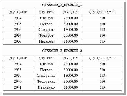 Для иллюстрации операций объединения, пересечения и взятия разности предположим, что в базе данных имеются два отношения СЛУЖАЩИЕ_В_ПРОЕКТЕ_1 и СЛУЖАЩИЕ_В_ПРОЕКТЕ_2 с одинаковыми схемами {СЛУ_НОМЕР, СЛУ_ИМЯ, СЛУ_ЗАРП, СЛУ_ОТД_НОМЕР} (имена доменов опущены по причине очевидности). Каждое из отношений содержит данные о служащих, участвующих в соответствующем проекте. На рис. показано примерное наполнение каждого из двух отношений (некоторые служащие участвуют в обоих проектах).