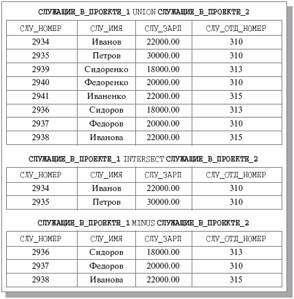 Рис. Результаты выполнения операций UNION, INTERSECT и MINUS