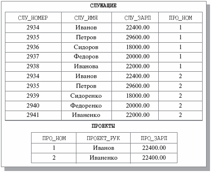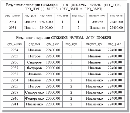 Рис. Результаты операций эквисоединения и естественного соединения отношений СЛУЖАЩИЕ и ПРОЕКТЫ