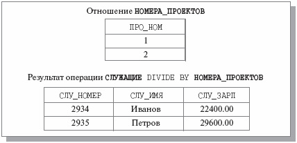 Для иллюстрации этой операции предположим, что в базе данных служащих поддерживаются следующие отношения: СЛУЖАЩИЕ, как оно было определено ранее, и унарное отношение НОМЕРА_ПРОЕКТОВ {ПРО_НОМ} (рис). Тогда запрос СЛУЖАЩИЕ DIVIDE BY НОМЕРА_ПРОЕКТОВ выдаст данные обо всех служащих, участвующих во всех проектах (результат операции приведен также на рис.).