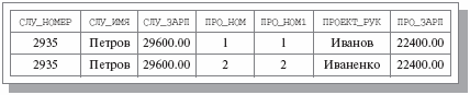 Рис. 3 Результат операции СЛУЖАЩИЕ JOIN ПРОЕКТЫ WHERE (СЛУ_ЗАРП > ПРО_ЗАРП)