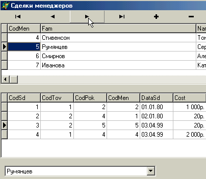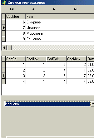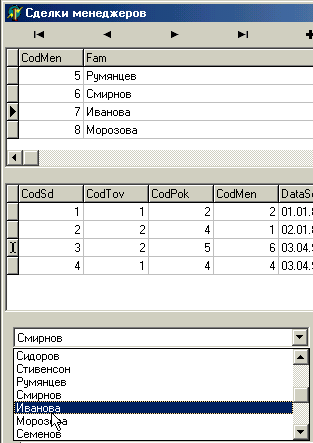 При редакции записи по сделке при выборе фамилии нового менеджера происходить изменение кода менеджера в таблице Сделки.