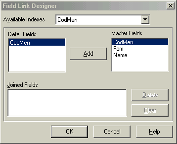 нажимаем мышку у поля CodMen таблицы SD.db и протаскиваем до поля поля CodMen таблицы Men.db. После отпускания кнопки мыши в новом окне выбираем поля связи CodMen и нажимаем на кнопку Add, а затем и на ОК.