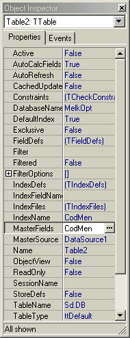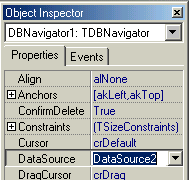При выборе элемента в дереве или на странице Components можно получить доступ к любому компоненту или его полю. Для этого нужно выделить в дереве вершину компонента (таблицы или поля). После этого в Инспекторе объектов можно редактировать свойства и события этого компонента.