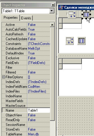 После изменения свойства DataBaseName зададим свойству Active компоненты Table 1 значение True. При выполнении ряда операций свойству Active автоматически задается значение False, поэтому следует контролировать значение данного свойства, чтобы информация из БД отображалась в форме.