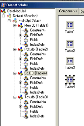 Перетащим с палитры компонент Table в поле Components модуля DataModule1 и изменим у компоненты Table1 ее свойство DataBaseName MelkOpt - название глобального псевдонима, который можно выбрать из выпадающего списка.