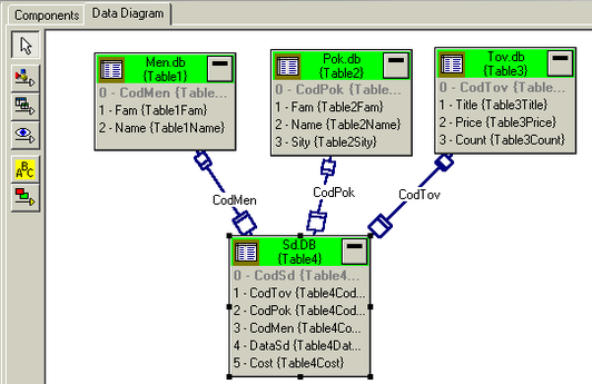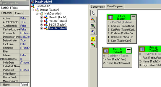 С помощью инспектора объектов для них выберем свойство DataBaseName и установим для него значение MelkOpt, определяющее псевдоним БД. Затем свойству TableName у компоненты Таble2 зададим значение Pok.db, у компоненты ТаbleЗ - Tov.db, у компоненты Таble4 - SD.db.