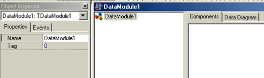 Перенос в модуль новых компонентов осуществляется щелчком на соответствующей пиктограмме палитры библиотеки компонентов и последующим щелчком в левой панели Проектировщика Модулей Данных или на его странице Components. В результате в дереве и на странице Components появляются соответственно вершина дерева и пиктограмма компонента.